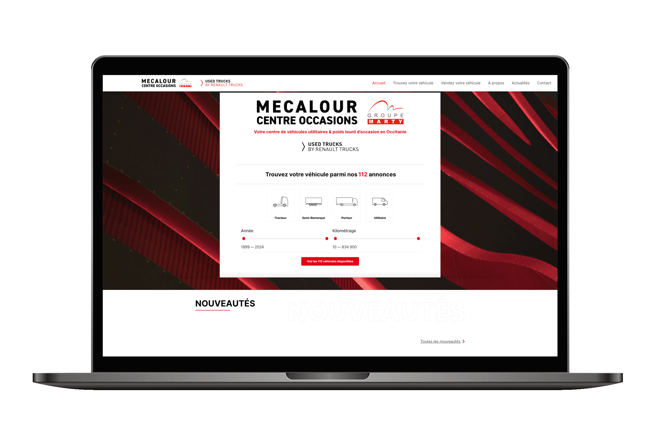 Depuis 2007, Mecalour Centre Occasions, filiale du Groupe Marty, est spécialisé dans la vente de véhicules utilitaires et poids lourds d’occasion multimarques. Labellisé Used Trucks by Renault Trucks, Mecalour a souhaité repenser son site internet afin d’optimiser la gestion de son stock et améliorer l’expérience utilisateur.
